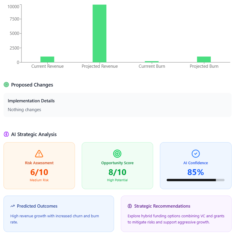 He inputs his current metrics and projected outcomes into Clarity.AI. The platform compares the tradeoffs like how VC funding supports a 10x revenue jump and user growth while maintaining runway and flags the potential risks. Based on the simulation, Clarity.AI recommends the funding route as the most sustainable for Dayo’s 12-month growth targets.